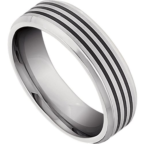 Gorgeous and elegant comfort fit flat band is 7mm wide with highly polished, beveled edges and three rows of recessed black enamel for a striking, two-tone contrast. Titanium rings are for people who create fashion trends and value the inspiration of the effect of technological advances in our culture and is excellent for those with allergies as this is hypoallergenic.About Titanium
