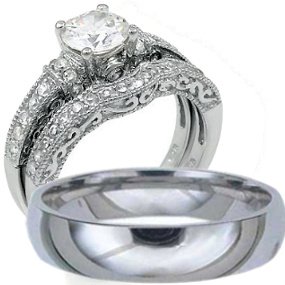Lowest Price His & Hers, 925 Sterling Silver & Titanium Engagement Wedding Ring Set, Men's Sizes 8-12, Women's sizes 5-9.